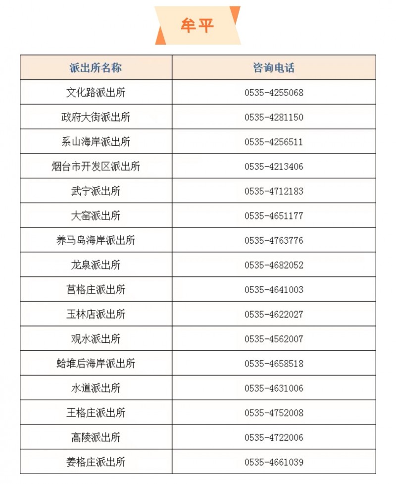 山东烟台市牟平区辖区各派出所户籍窗口服务电话大全表: