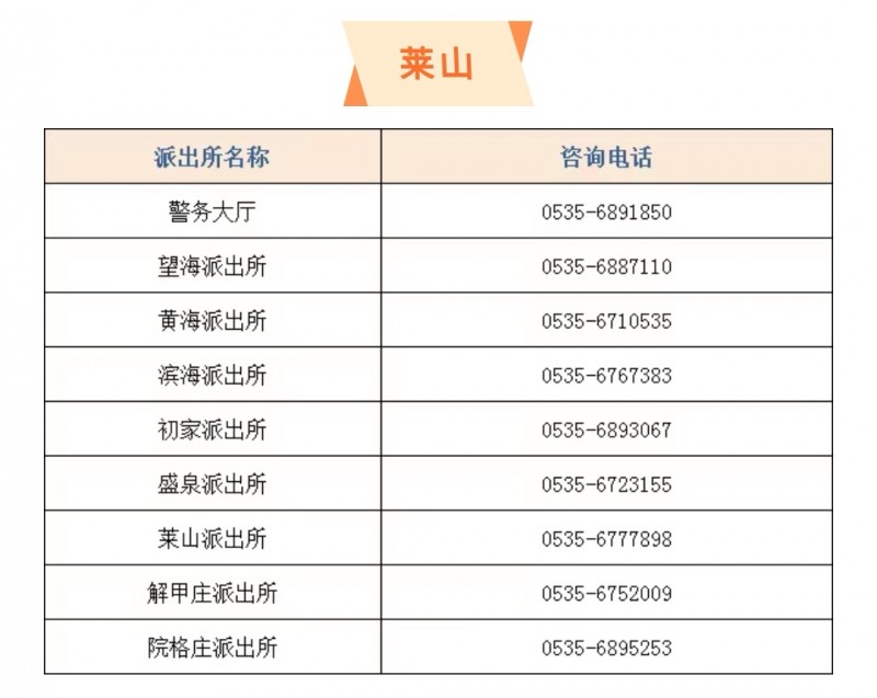 山东烟台市莱山区辖区内各个派出所户籍窗口服务电话大全表: