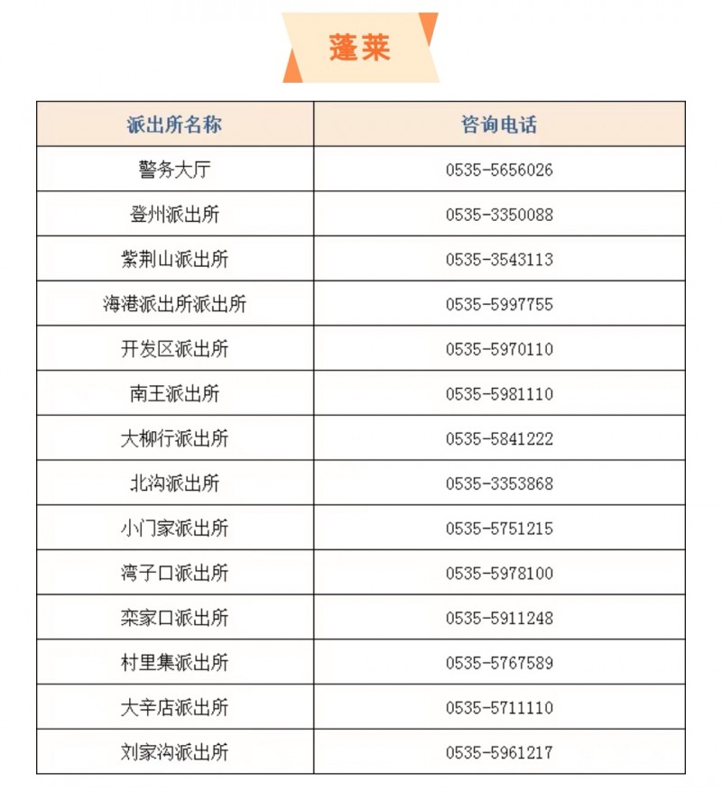 山东烟台市蓬莱区各个派出所户籍窗口服务电话大全表:
