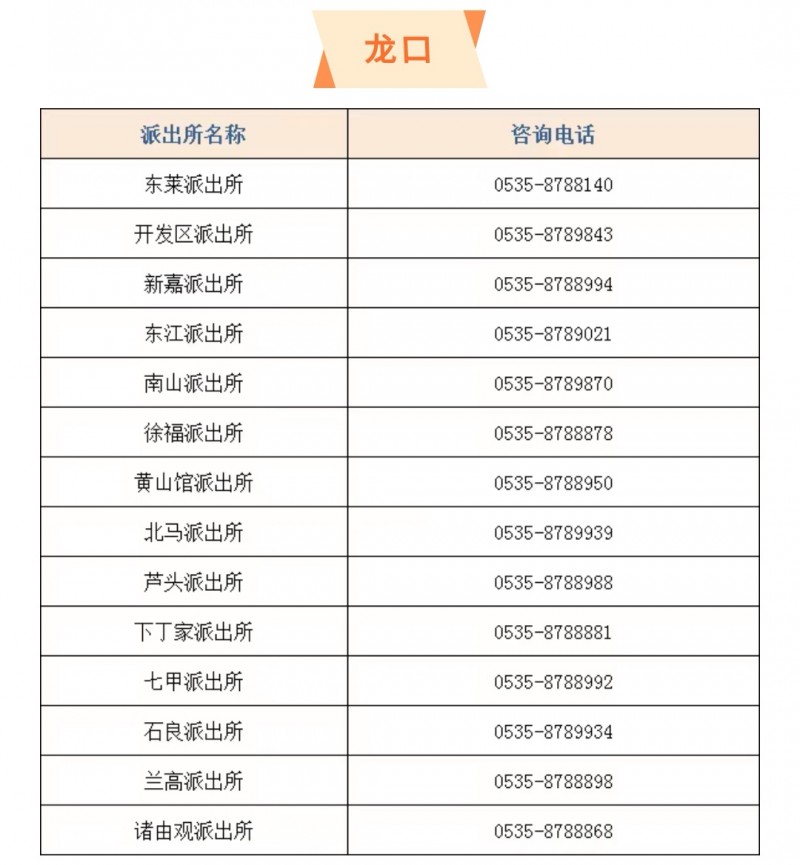 山东烟台龙口市辖区各个派出所户籍窗口服务电话大全表: