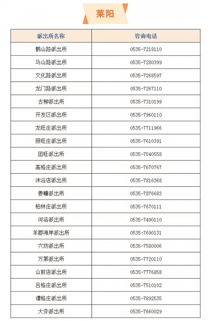山东烟台莱阳市行政辖区内各派出所户籍窗口服务电话大全表: