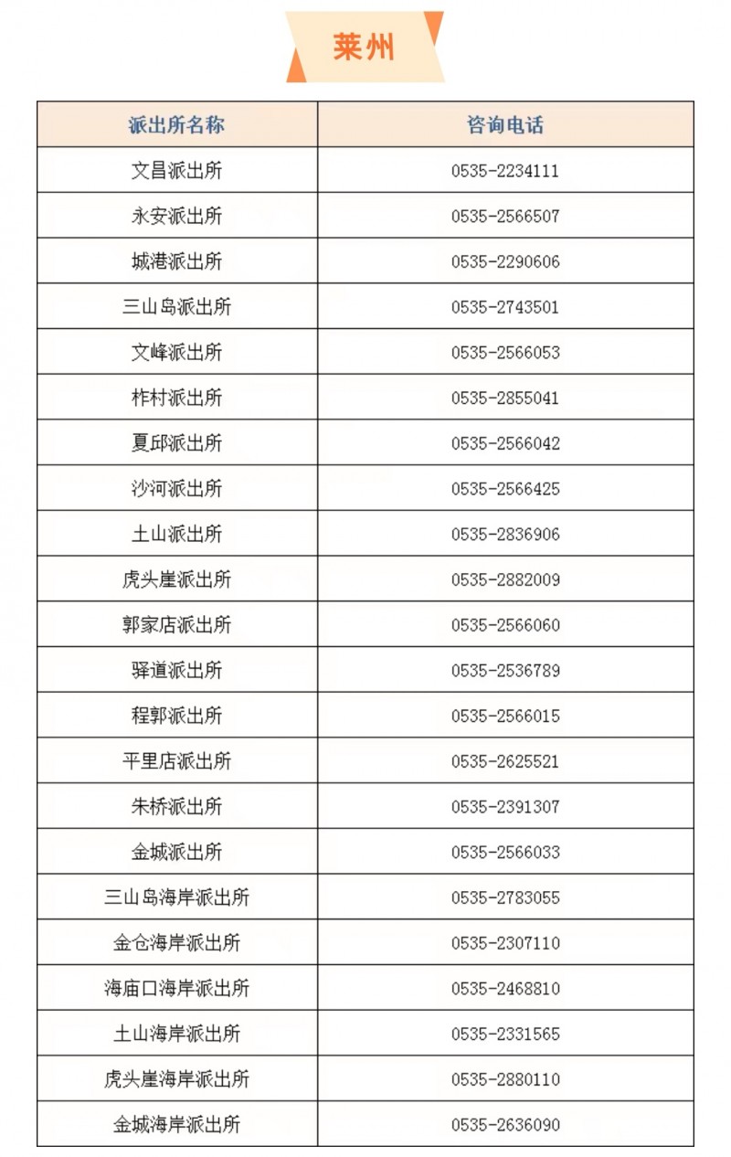 山东烟台莱州市辖区各个派出所户籍窗口服务电话大全表: