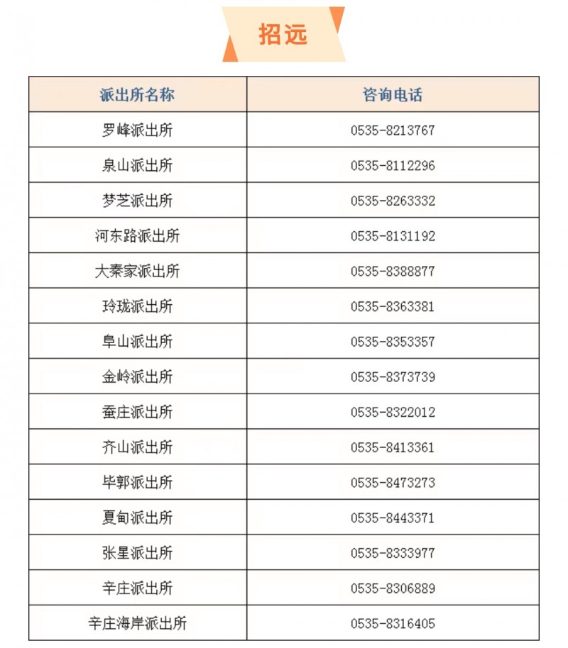山东烟台招远市各个派出所户籍窗口服务电话大全表: