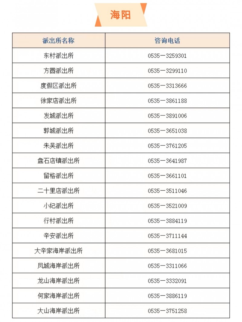 山东烟台海阳市辖区各派出所户籍窗口服务电话大全表: