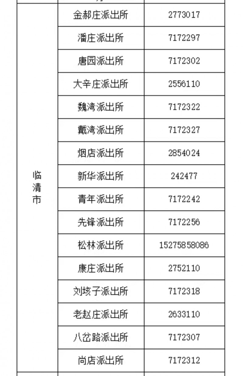 山东聊城临清市辖区各个派出所户籍窗口咨询服务电话汇总表: