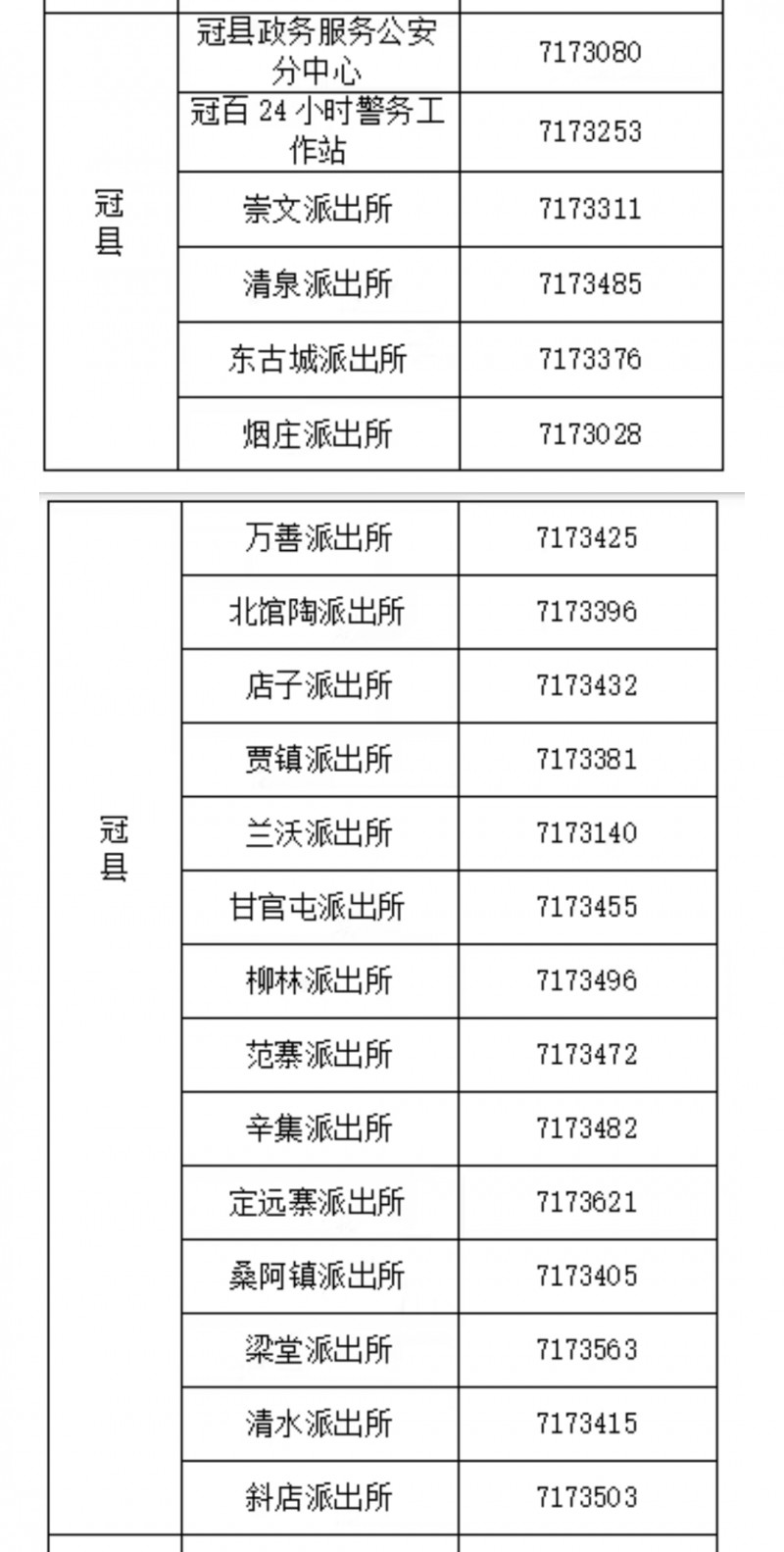 山东聊城市冠县辖区各派出所户籍窗口咨询电话汇总表: