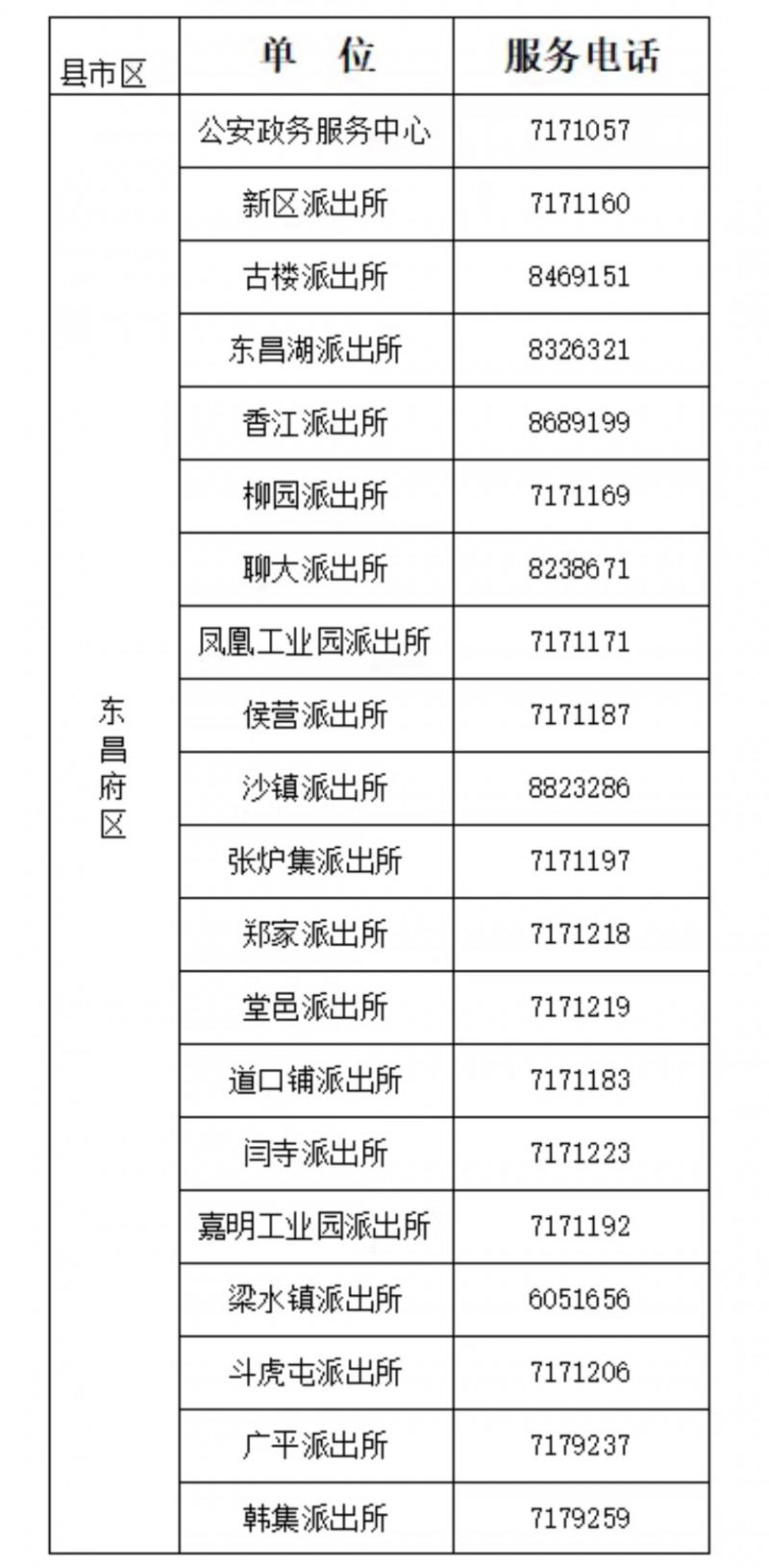 山东聊城市东昌府区辖区各个派出所户籍窗口咨询服务电话汇总表: