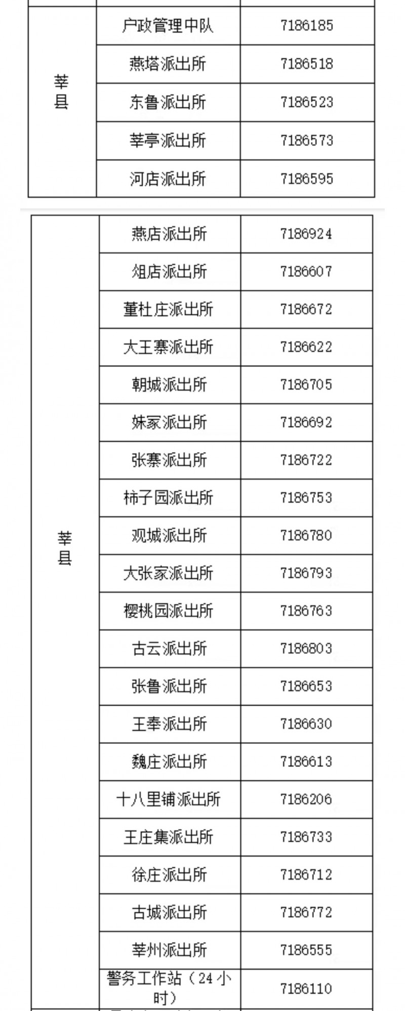 山东聊城市莘县辖区内各个派出所户籍窗口咨询服务电话汇总表: