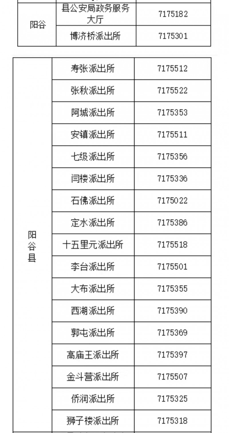 山东聊城市阳谷县辖区各个派出所户籍窗口咨询电话汇总表: