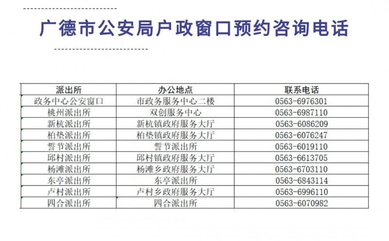 免责声明:关于广德市各派出所户政窗口预约咨询电话和办公地点汇总德便民信息作出免责声明,此信息仅供参考。