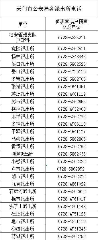天门市辖区各派出所值班室和户籍室联系电话汇总表:为群众提供便捷、高效、优质、满意的服务。现将天门市各个派出所值班室电话和户籍室电话汇总表公告如下。
