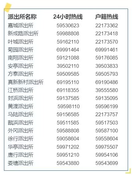 上海市嘉定区辖区各派出所24小时热线电话和户籍业务咨询热线电话汇总表如下: