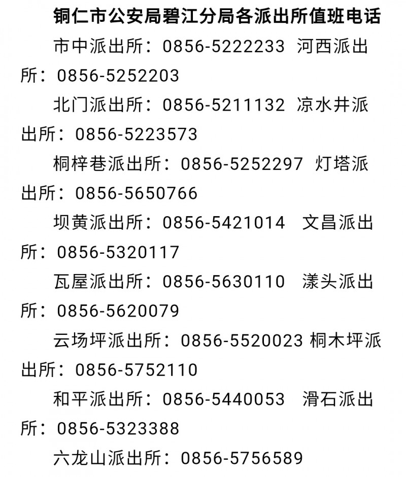 免责声明:关于铜仁市行政区内各派出所户籍窗口业务办理值班服务电话大全表的便民作出免责声明,此信息来源于铜仁市政府相关机构网络公开内容,整理转发的目的是更大范围传播便民信息,此信息仅供参考。