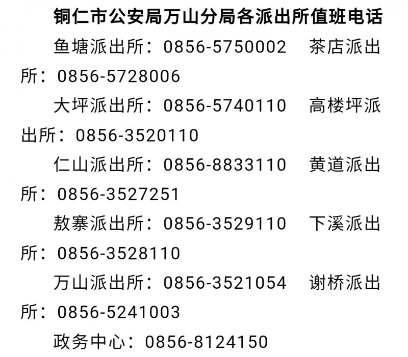 铜仁市万山区行政区内各派出所户籍窗口业务办理值班服务电话大全表:
