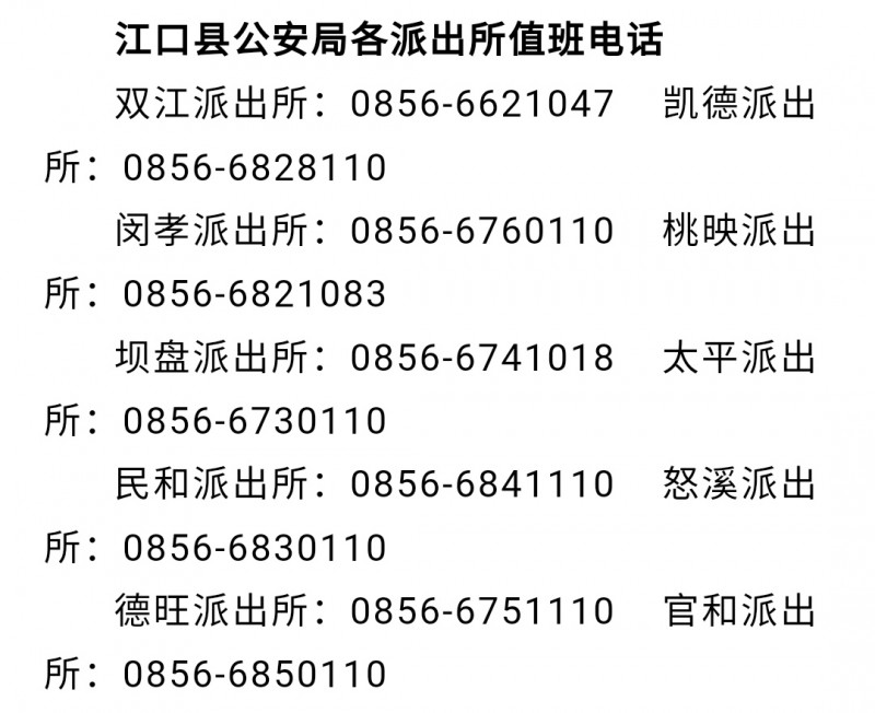 铜仁市江口县行政区内各派出所户籍窗口业务办理值班服务电话大全表: