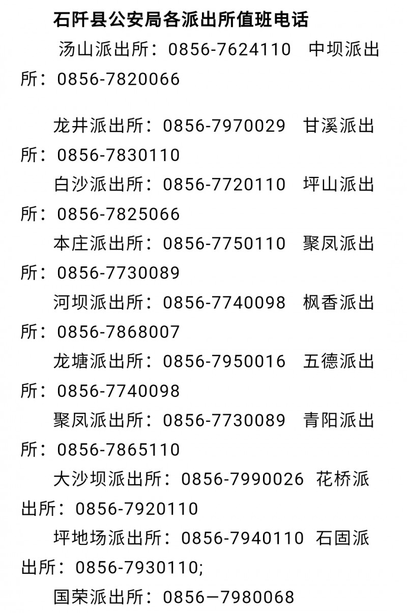铜仁市石阡县行政区内各派出所户籍窗口业务办理值班服务电话大全表: