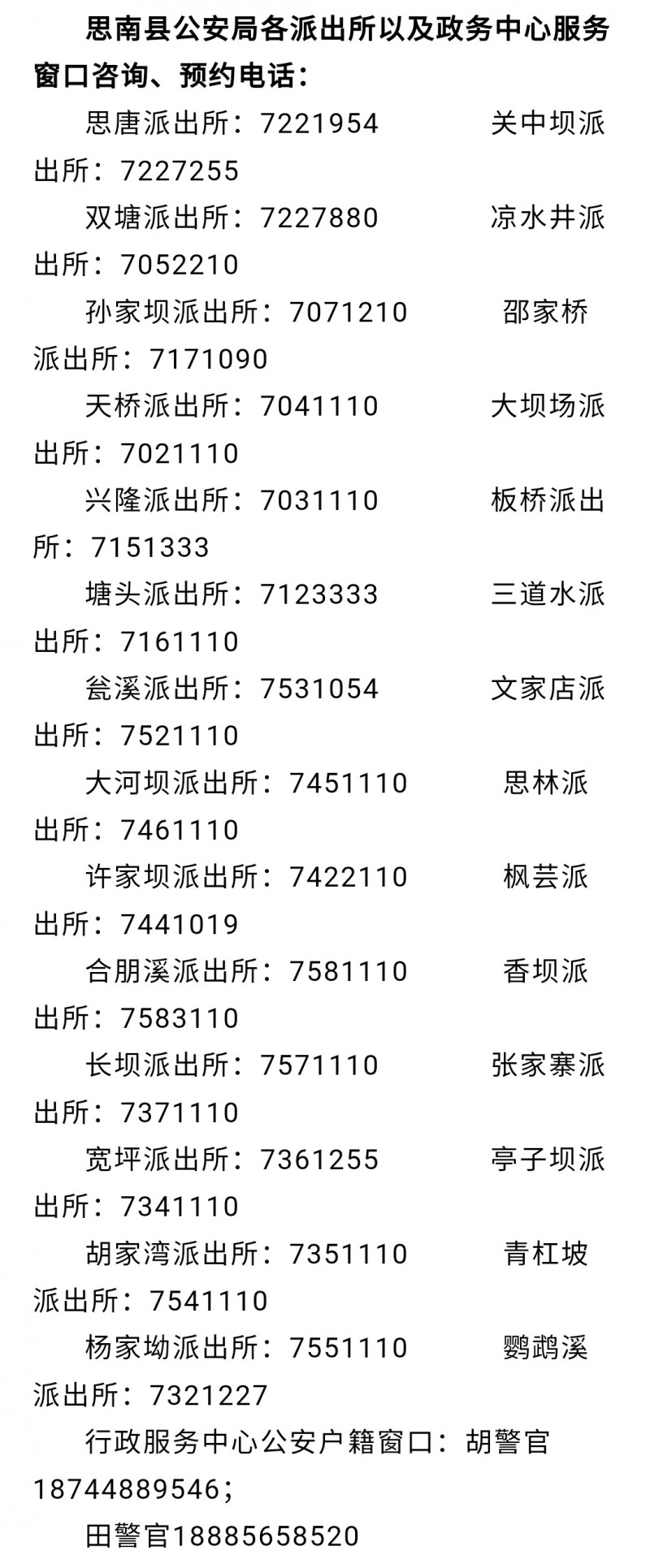 铜仁市思南县行政区内各派出所户籍窗口业务办理值班服务电话大全表: