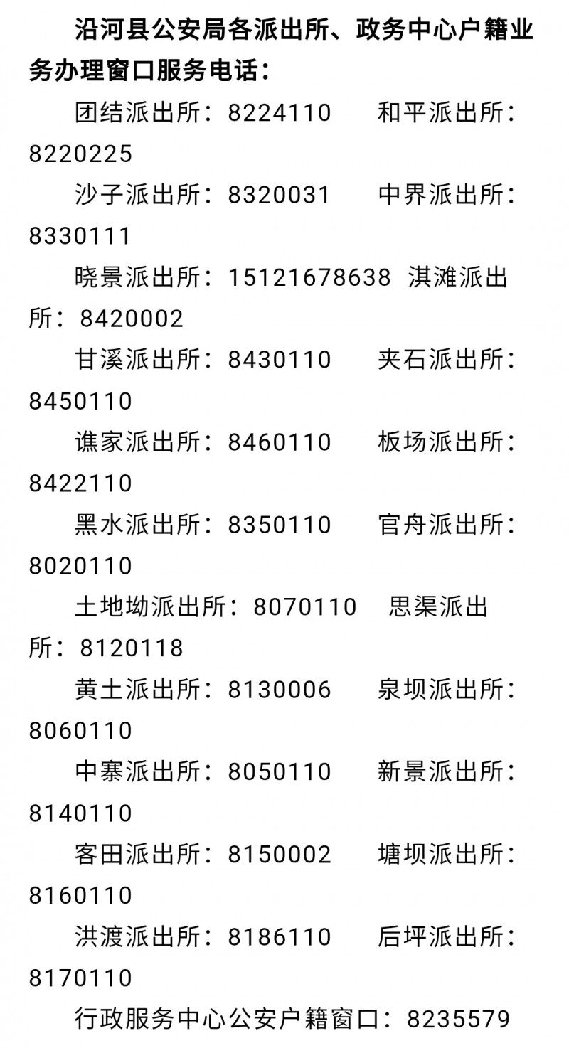 铜仁市沿河县行政区内各派出所户籍窗口业务办理值班服务电话大全表: