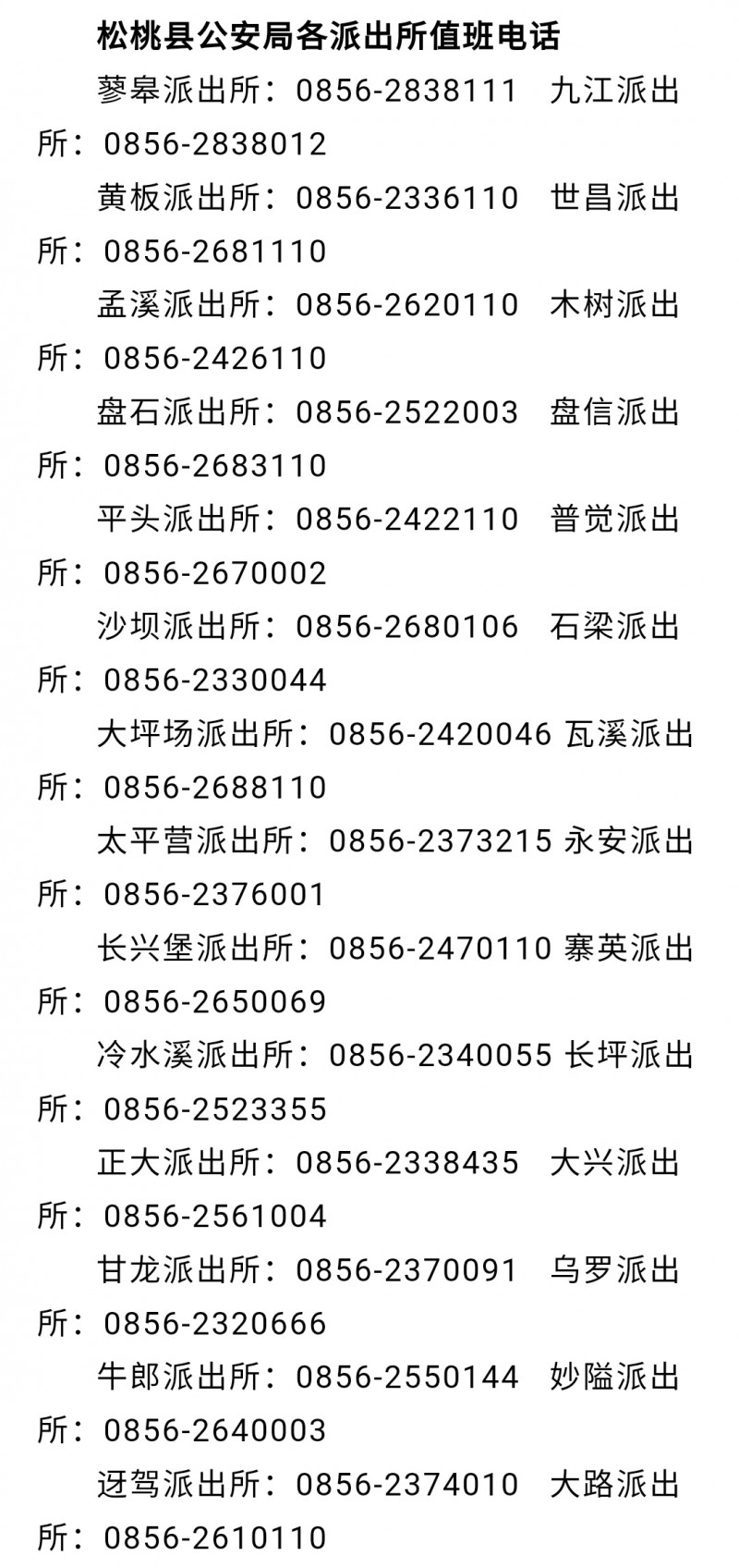 铜仁市松桃县辖区各派出所户籍窗口业务办理值班服务电话大全表: