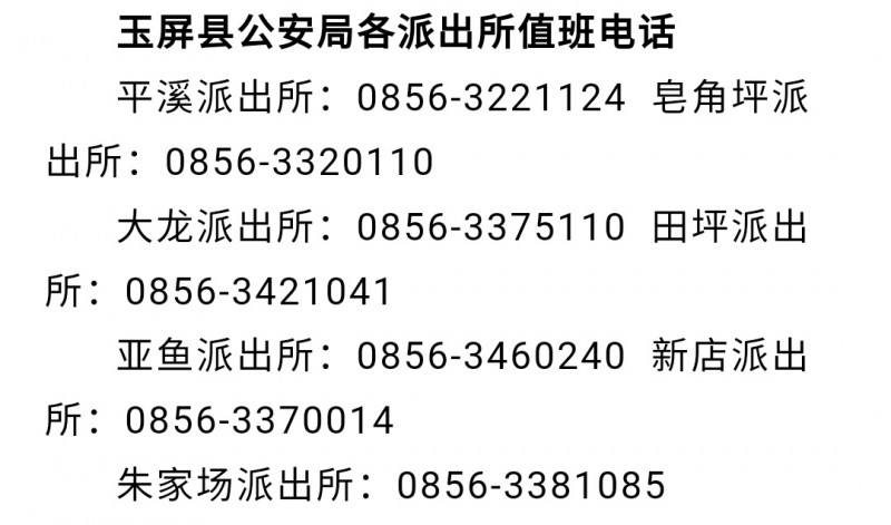 铜仁市玉屏县辖区各派出所户籍窗口业务办理值班服务电话大全表: