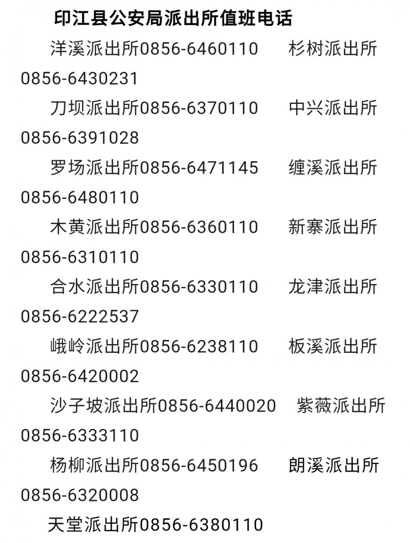 铜仁市印江县全县各派出所户籍窗口业务办理值班服务电话大全表: