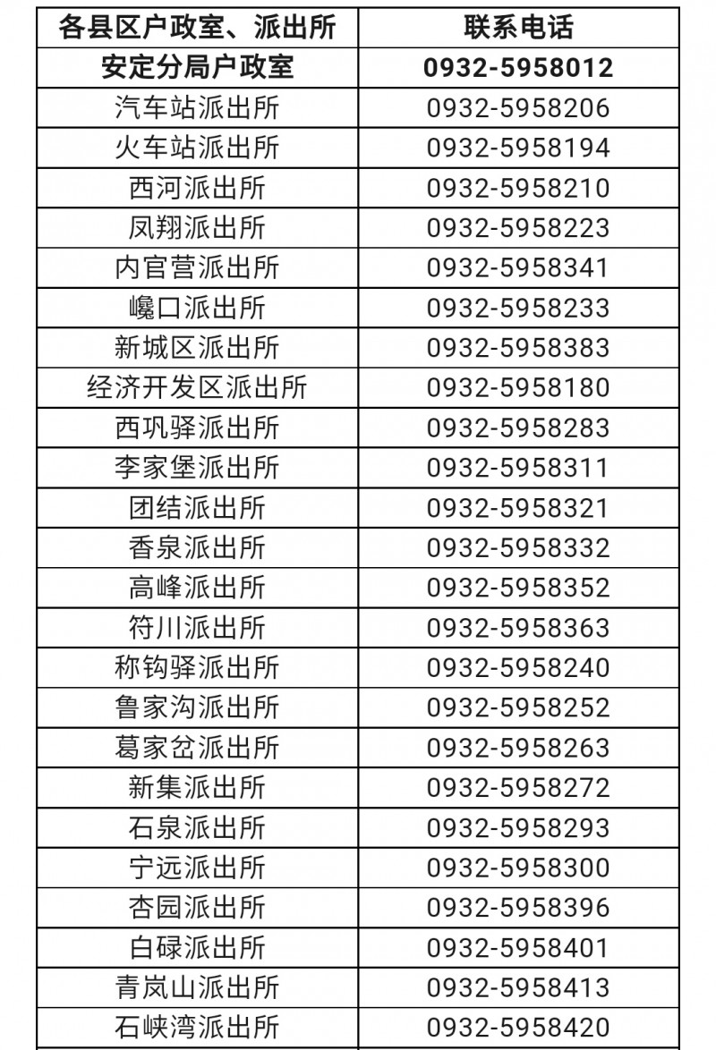 定西市安定区户政室和各派出所户籍窗口联系电话目录表: