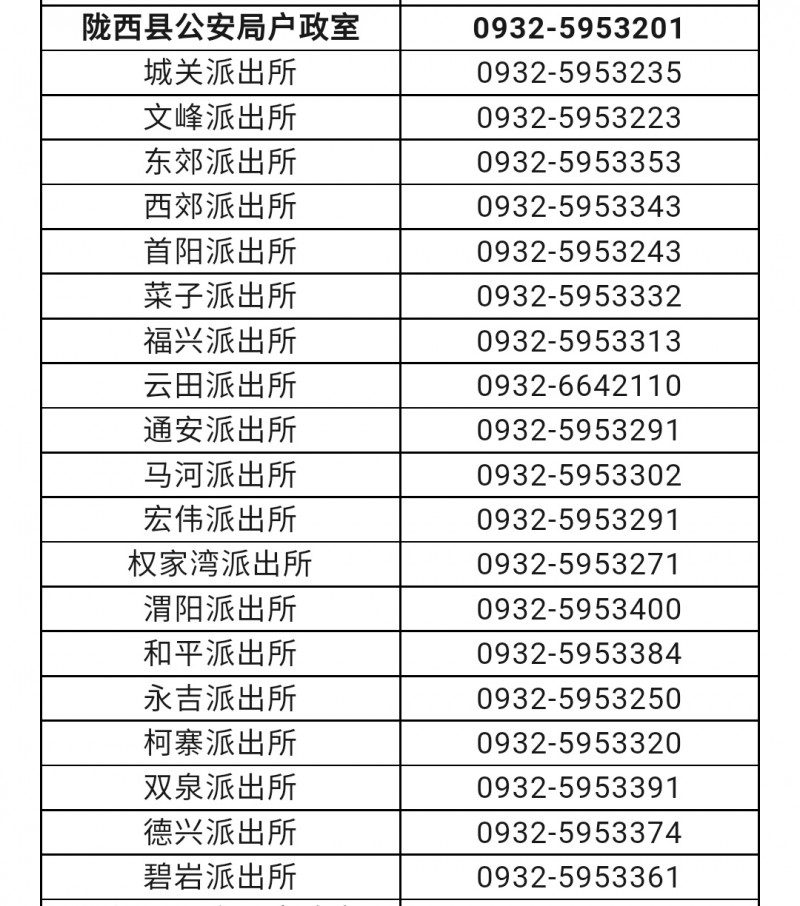 定西市陇西县户政室和各派出所户籍窗口联系电话目录表: