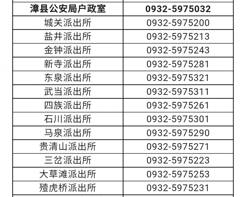 定西市漳县户政室和各派出所户籍窗口联系电话目录表: