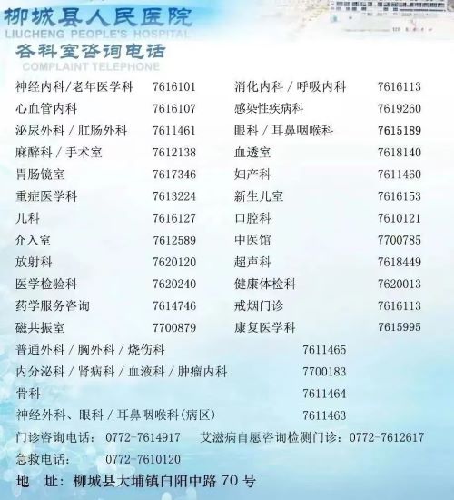 柳城县人民医院急救电话:0772-7610120,柳城县人民医院一站式便民服务中心咨询电话:0772-7614917