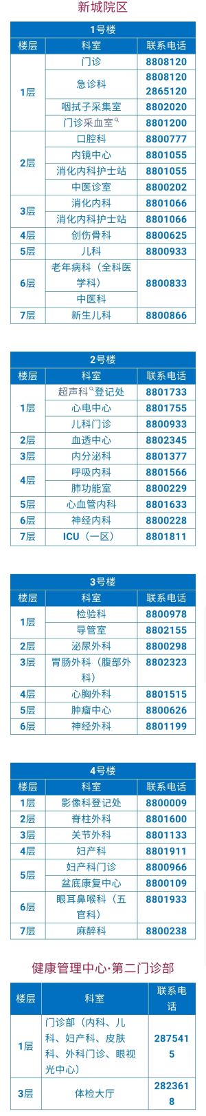 新城院区新城院区是按三级医院标准建设的现代化医院,占地82亩,建筑面积8万多平方米,主要分为医疗工作区和后勤保障区两大区域。全面开放使用后床位数达800张,开设20多个二级诊疗科目的临床科室,包括内科、外科、骨科、儿科、妇产科、五官科、中医科、康复科、口腔科等,以及相关功能辅助科室。拥有一批高端医学影像设备,部分设备领先全市同级医院。设有四个重症抢救科室(ICU),手术室有3间百级和8间万级手术间,新设透析中心、碎石中心、影像中心、心电中心、卒中中心、胸痛中心、肿瘤中心和介入诊疗中心等医疗中心。