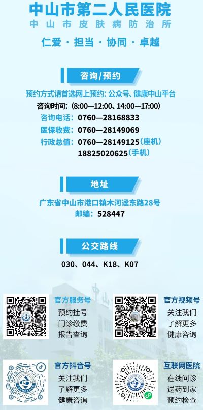 中山市第二人民医院一站式服务中心:0760-28168833,医学美容中心:0760-28149030,肺科门诊:0760-28339103。