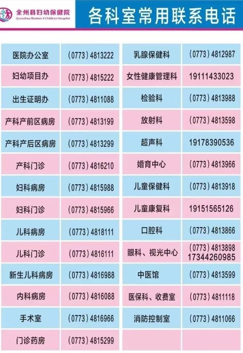 全州县妇幼保健院医院办公室电话:(0773)4813222,全州县妇幼保健院产科产前区电话:(0773)4813199,全州县妇幼保健院产科产后区电话:(0773)4813299 。全州县妇幼保健院各科室常用联系电话信息表格如下: