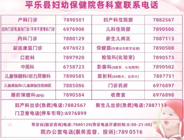 平乐县妇幼保健院产科住院部电话:0773-788 2567,平乐县妇幼保健院妇科住院部电话:0773-6976908,平乐县妇幼保健院,儿科住院部电话:0773-789 0506平乐县妇幼保健院,新生儿病区电话:0773-788 7113