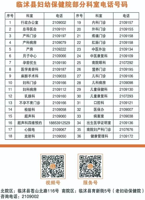 临沭县妇幼保健院部分科室电话号码一览表如下: