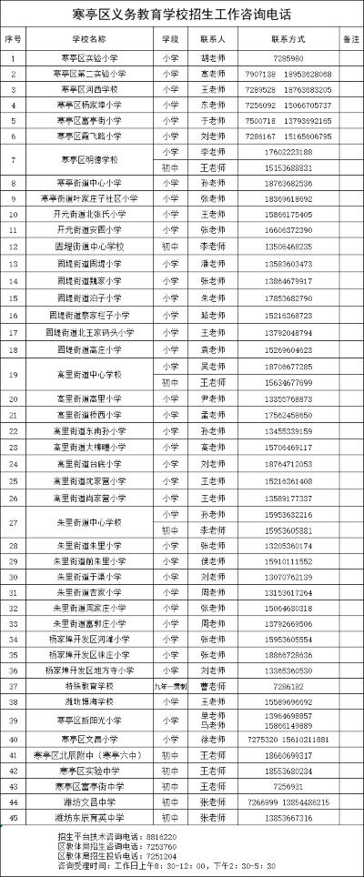 2025年招生工作方案拟于6月中下旬通过“寒亭教育”微信公众号发布,有关具体要求敬请关注。其他未尽事宜,可电话咨询,咨询电话附后。潍坊市寒亭区义务教育学校招生工作咨询电话如下: