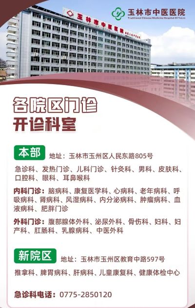 提示:关于玉林市中医医院两个院区地址及急诊科电话的信息作出免责声明:关于此信息作出免责声明,此信息图文仅供参考,小编不承担任何法律责任。此信息来源于有关机构的公开内容,在此经过整理并转载,唯一的目的是通过互联网传播便民惠民信息。由于时间等原因,难免使信息发生变更,此信息如有侵权,或者差错,请联系删除,直接联系秋果黄页网客服电话(187-8199-3958微信同号),一定会及时删除和修正。