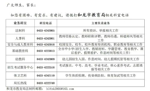 说明:关于和龙市教育局相关科室业务电话表的信息作出免责声明:关于此信息作出免责声明,此信息图文仅供参考,小编不承担任何法律责任。此信息来源于有关机构的公开内容,在此经过整理并转载,唯一的目的是通过互联网传播便民惠民信息。由于时间等原因,难免使信息发生变更,此信息如有侵权,或者差错,请联系删除,直接联系秋果黄页网客服电话(187-8199-3958微信同号),一定会及时删除和修正。