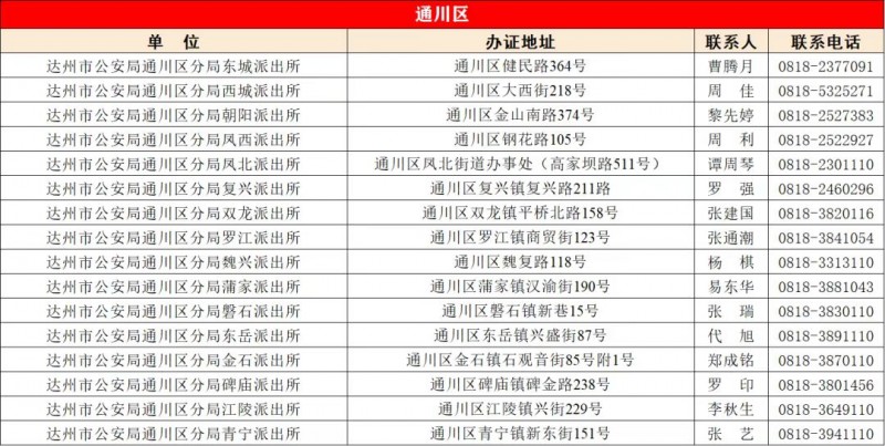 达州市通川区户政热线(通川区各派出所户籍窗口地址和联系电话)信息表如下: