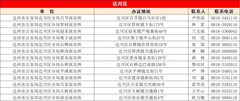 达州市达川区户政热线(达川区各派出所户籍窗口地址和联系电话)信息表如下: