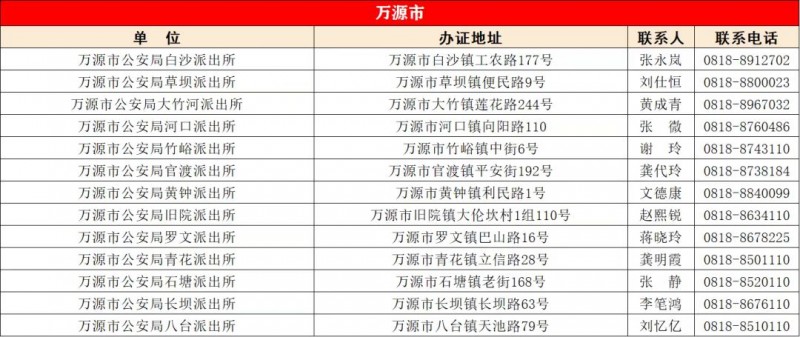 达州万源市户政热线(万源市各派出所户籍窗口地址和联系电话)信息表如下: