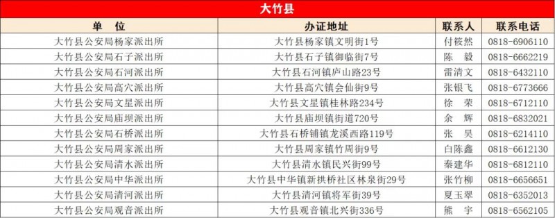 达州市大竹县户政热线(大竹县各派出所户籍窗口地址和联系电话)信息表如下:
