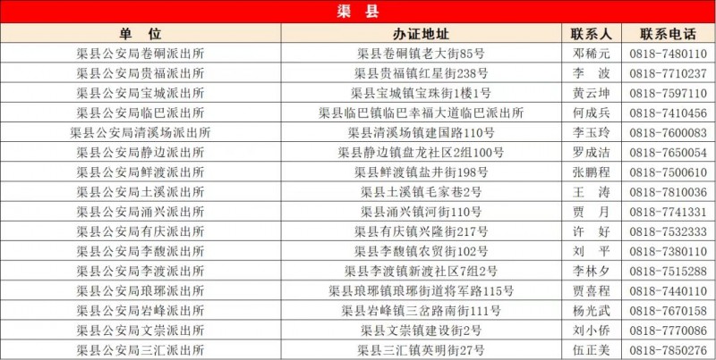 达州市渠县户政热线(渠县各派出所户籍窗口地址和联系电话)信息表如下: