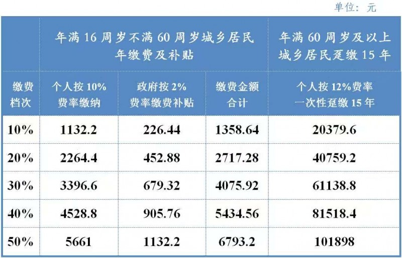 年满16周岁不满60周岁城乡居民按所选档次缴费后,政府按缴费基数的2%给予缴费补贴,年满60周岁及以上城乡居民一次性趸缴至15年的,不能享受政府缴费补贴。