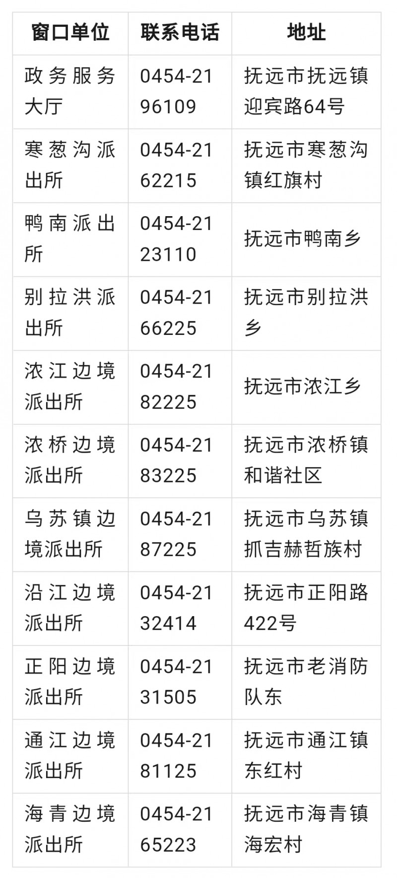 通江边境派出所户籍身份证咨询电话:0454-2181125,地址:抚远市通江镇东红村