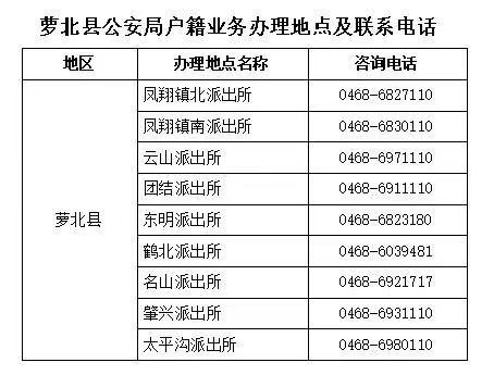 鹤岗市萝北县各基层派出所户籍业务办理地点和电话汇总表