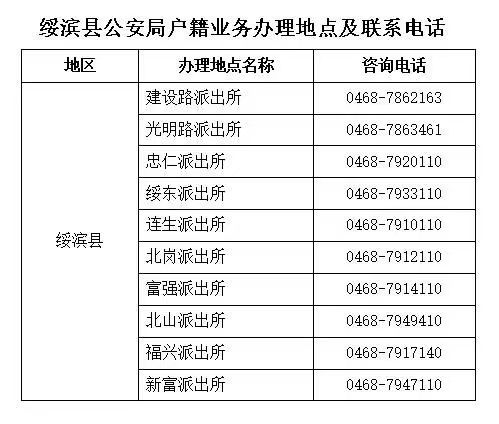 鹤岗市绥滨县各基层派出所户籍业务办理地点和电话汇总表