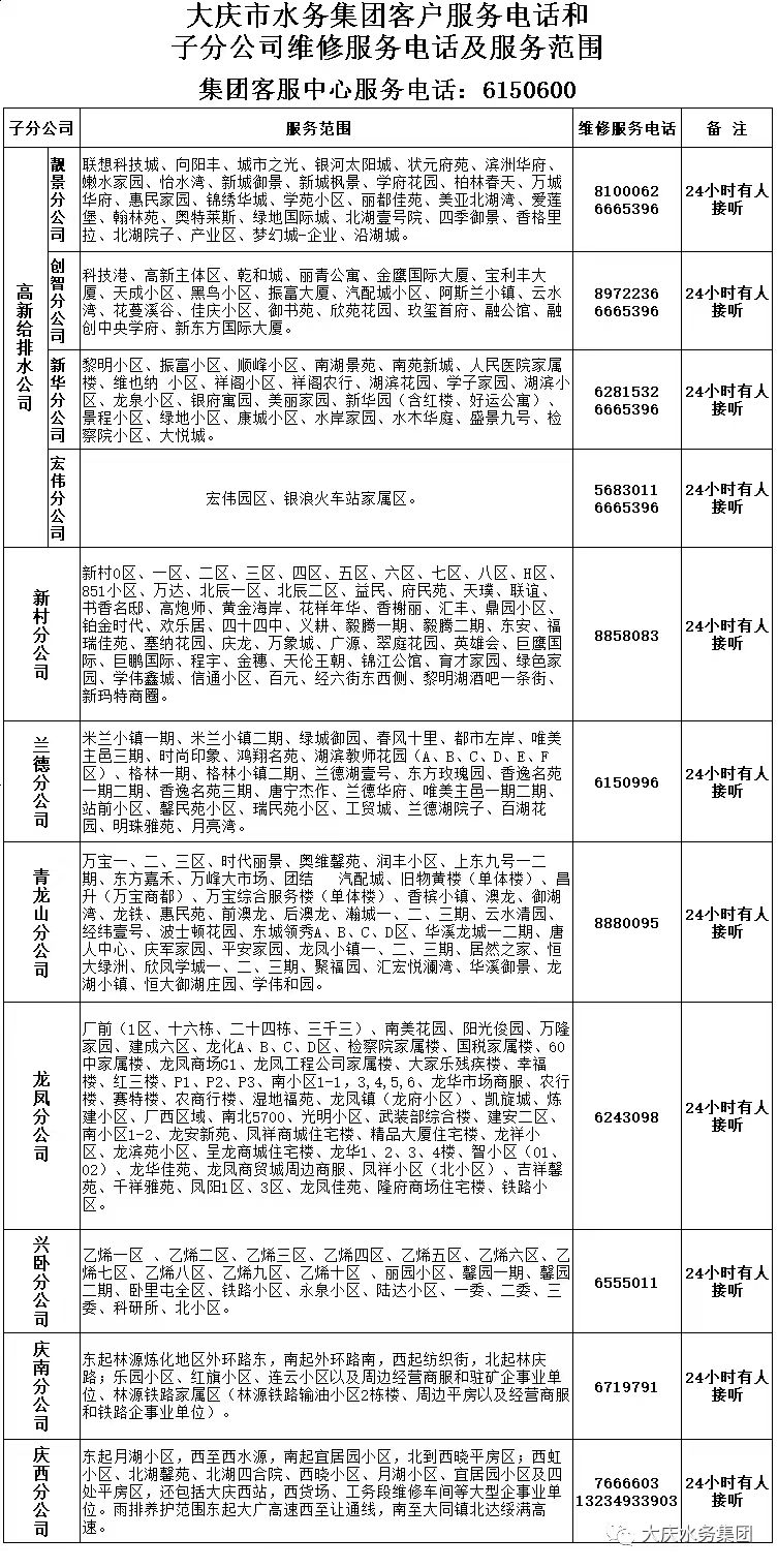 便民信息-大庆市水务集团客户服务电话和分公司维修服务电话信息表如下: