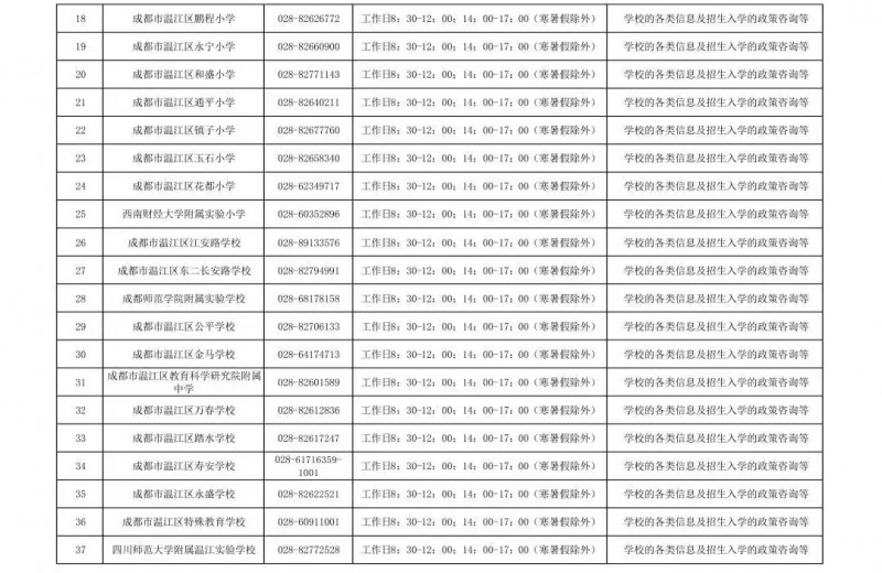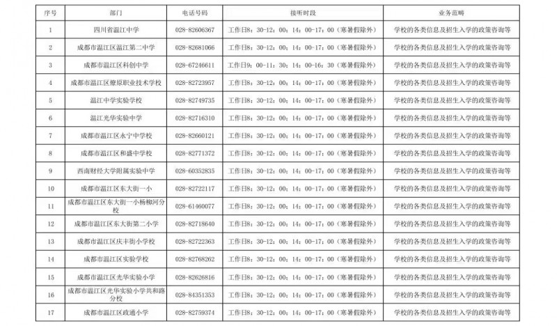 成都市温江区各中学校和小学校对外联系电话号码信息表如下: