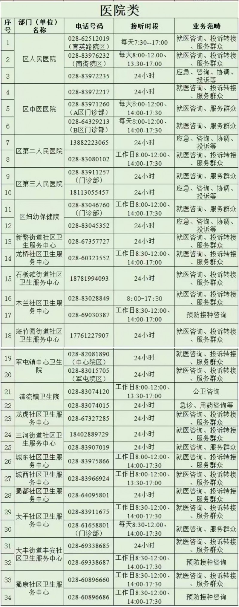 成都市新都区范围内公立医疗机构对外咨询电话号码信息表如下:
