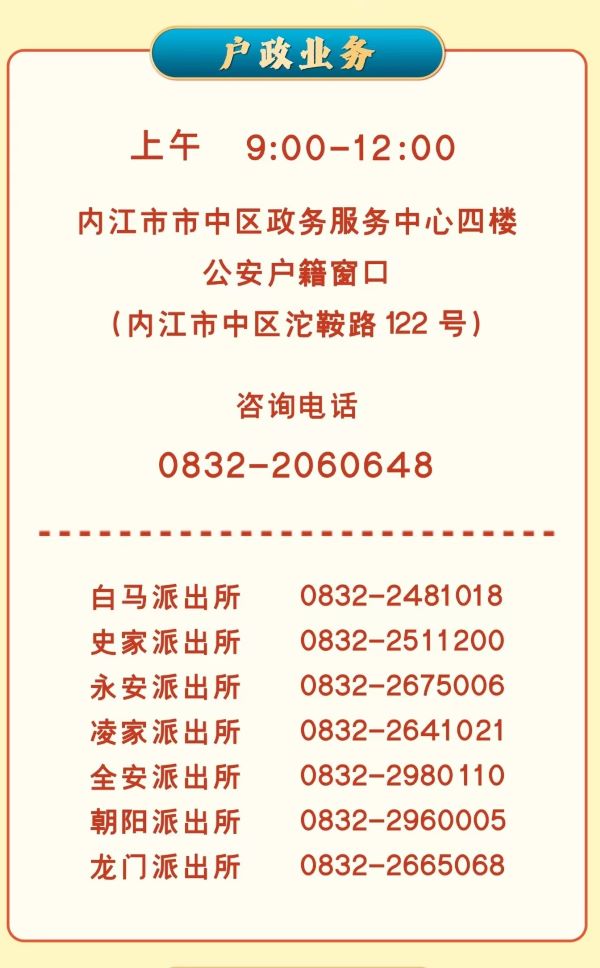 内江市市中区户政业务(政务中心和派出所户籍窗口)咨询电话: